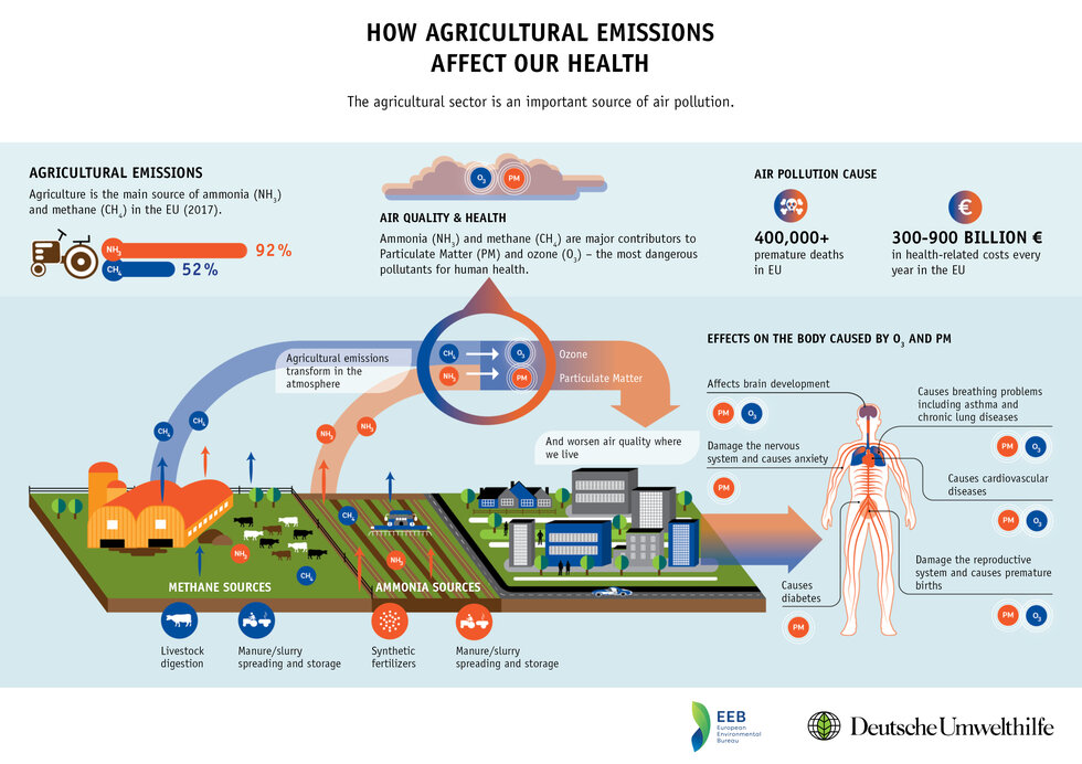 Agriculture is a common driver for both air pollution and climate change. Many agricultural activities rely on energy consumption of relevant machinery and equipment, resulting to significant emissions of Greenhouse Gases (GHGs) and air pollutants. The main GHGs associated with agriculture are CO2 and CH4 from livestock and N2O from crop fields. The main air pollutants related to agricultural activities are NH3 and PM (mainly PM2.5 and PM10). PM emitted from agricultural activities account for around 16% of PM10 emissions in the EU emission inventory of 2019. Furthermore, N2O emission from agricultural soil management, as a result of biological nitrification and denitrification processes in soils, is an important contributor in GHGs emissions, accounting for 74% of total N2O emissions in the U.S. According to the latest EU GHG inventory, GHG emissions in the agricultural sector represent almost 10% of the total EU GHG emissions. Fertilizer application in agricultural soils is an important agricultural source of NH3, NOx and N2O emissions, accounting for 93%, 8% and 5.9% of total EU emissions, respectively. Similarly, in both Canada and the US, the agricultural sector is the dominant source of NH3, accounting for 93% of national emissions (Canadian Air Pollutant Emissions Inventory, 2020; US EPA National Emission Inventory, 2020). The alkaline atmospheric ammonia from N fertilizer application is a key precursor to the formation of inorganic fine airborne particulate matter (PM2.5), following the reaction with sulfuric and nitric acid, with significant health, environmental and climatic effects.