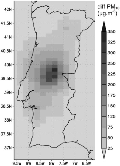 Figure 1. Spatial differences (μg.m−3) between simulation results with (forest fire simulation) and without (baseline simulation) smoke emissions, for PM10 daily averages on August 3, 2003 (Martins et al., 2012).